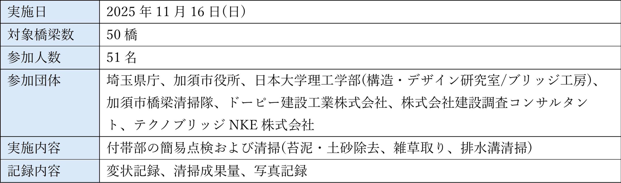 土木・建築分野で幅広いエンジニアリングサービスを展開するテクノブリッジNKE株式会社(本社:東京都千代田区、代表取締役:田中 宏和)は、埼玉県加須市と日本大学理工学部土木工学科、加須市橋梁清掃隊、ドーピー建設工業株式会社(本社:北海道札幌市中央区、代表取締役社長:八木橋 浩隆)、株式会社建設調査コンサルタント(本社:東京都練馬区、代表取締役:定塚 賢次朗)と連携し、加須市内の橋梁を対象とした簡易点検および清掃活動を実施しました。