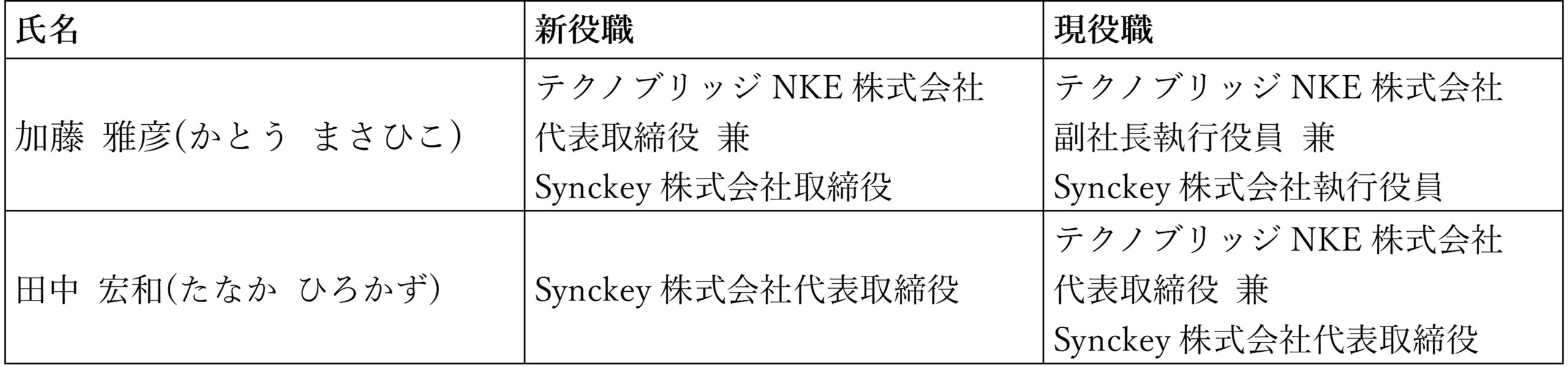 今回の新体制移行により、Synckeyグループ全体の経営基盤強化と機動的な意思決定を図るとともに、テクノブリッジNKEにおける事業成長の加速と、さらなる顧客価値の向上を目指してまいります。